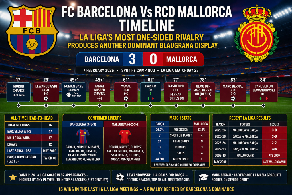 FC Barcelona 3–0 RCD Mallorca | La Liga Matchday 23 | February 7, 2026 | Spotify Camp Nou  Goals: Robert Lewandowski (29′), Lamine Yamal (61′), Marc Bernal (83′) Barcelona XI (4-3-3): Joan Garcia – Koundé, Araújo, Cubarsí, Baldé – Fermín, Casado, Olmo – Yamal, Lewandowski, Rashford Mallorca XI (4-2-3-1): Leo Román – Maffeo, López, Valjent, Mojica – Mascarell, Costa – Morey, Torre, Virgili – Muriqi